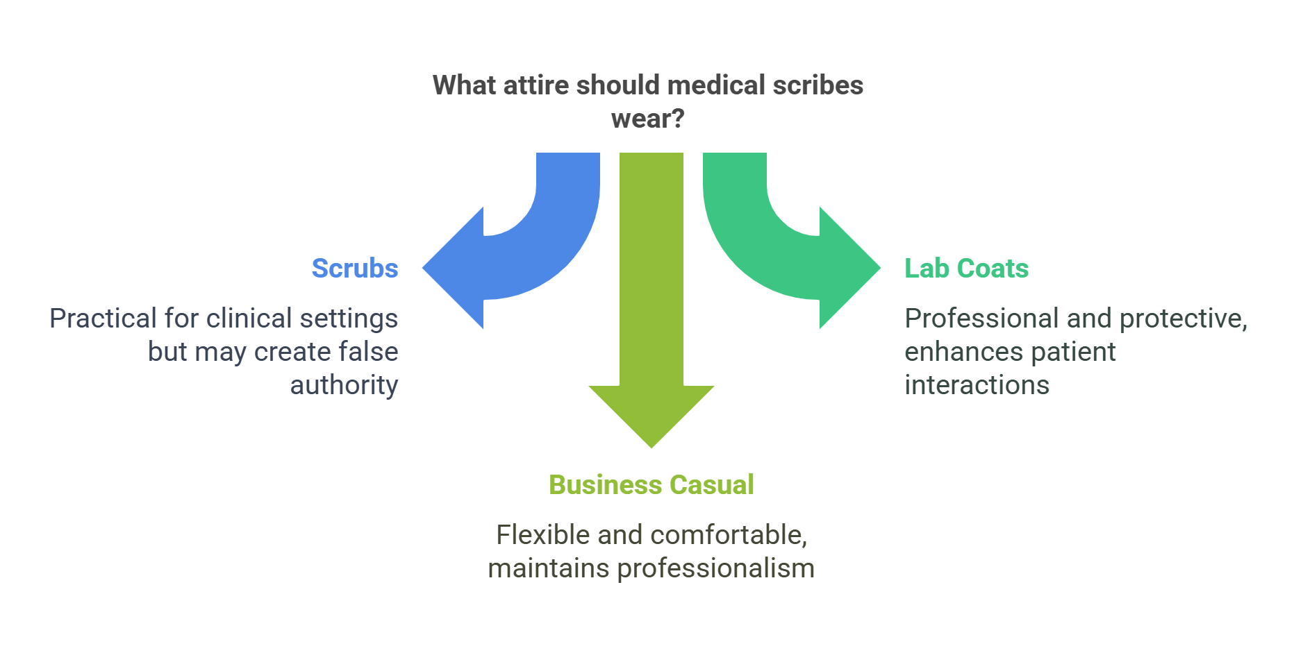 Generally, medical scribes should wear business casual attire, such as slacks, dress shirts, and comfortable shoes. The attire should align with the facility’s dress code, but it should always remain professional. Scribes may also be required to wear lab coats or scrubs depending on the facility's rules and the nature of their work.