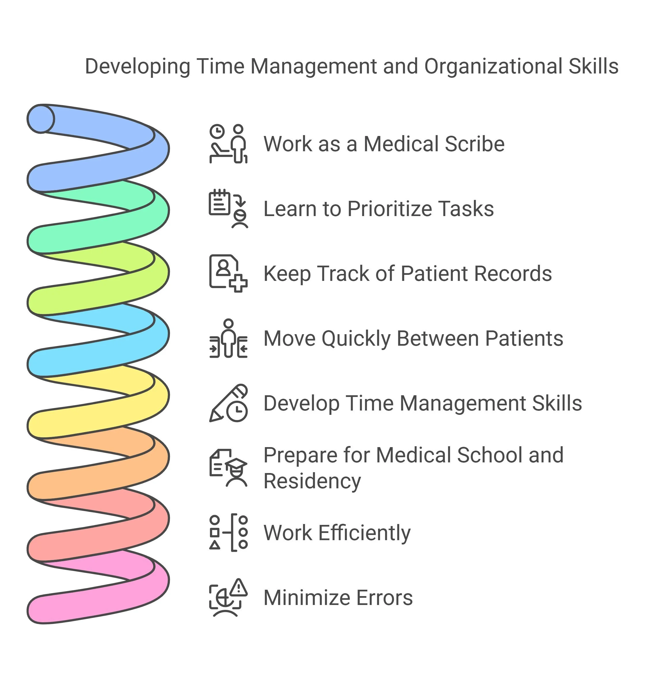 During your time as a scribe, you will often find yourself moving quickly from one patient to another, ensuring that everything is documented efficiently and accurately. In doing so, you will naturally develop strong time management skills that will prepare you for the pace of medical school and residency, where time constraints and scheduling conflicts can make life stressful. Being organized and managing your time well will allow you to work more efficiently, minimize errors, and provide better care for your future patients.