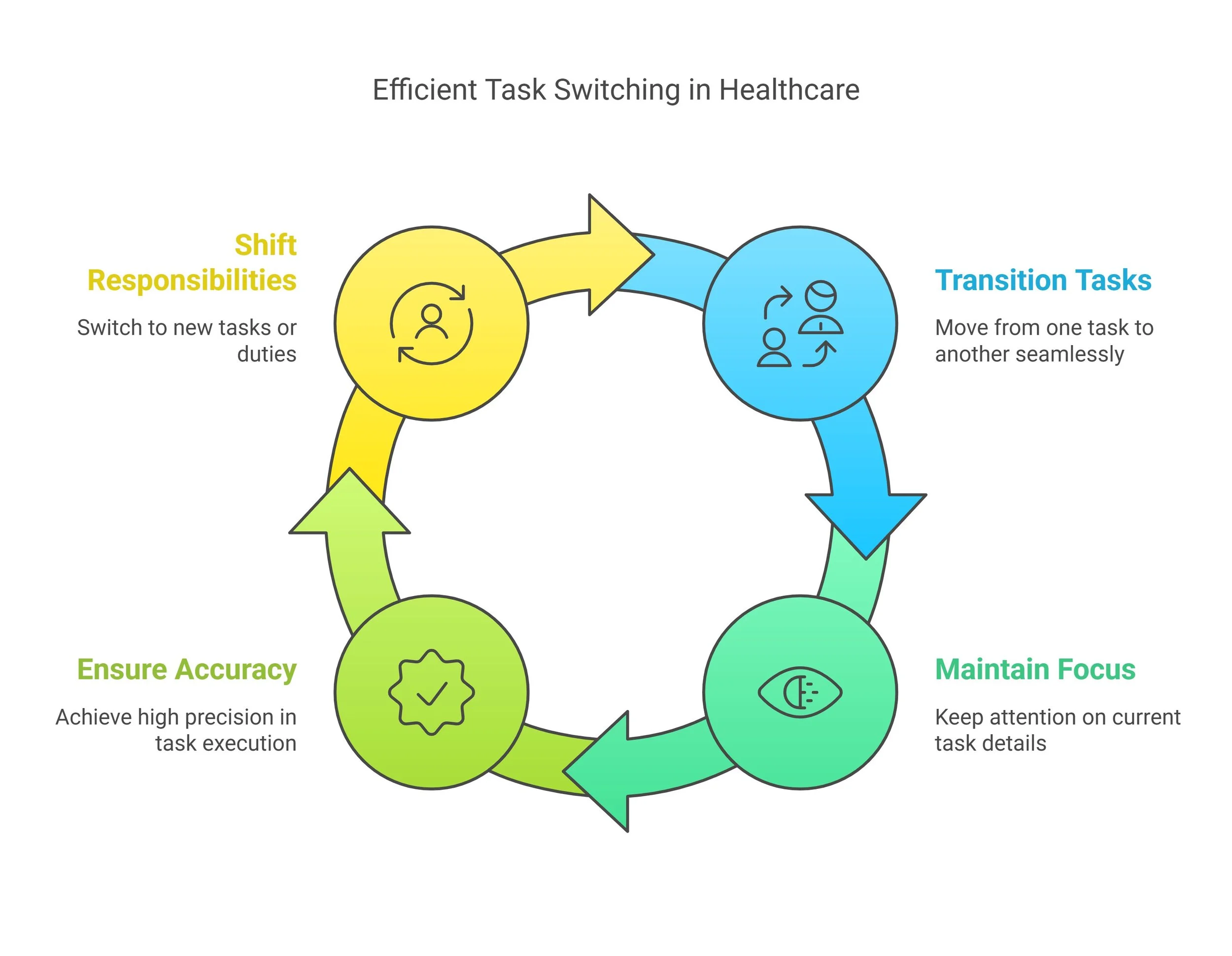 Example: A scribe may switch from documenting a patient's physical exam to taking notes on an ongoing conversation about a different patient's treatment plan without losing concentration.