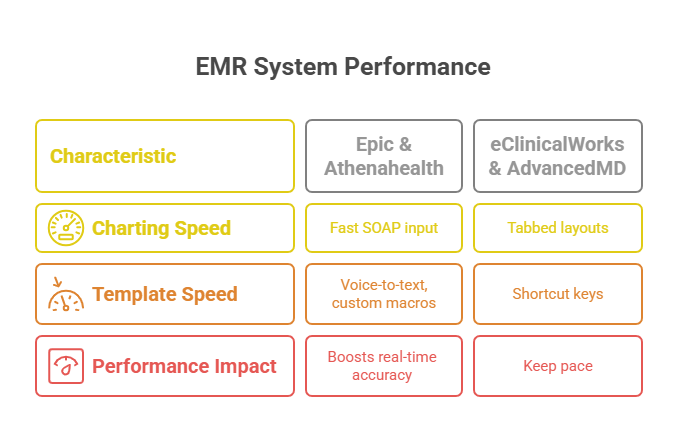 For scribes, lag kills productivity. EMRs like Epic and Athenahealth are preferred because they allow real-time SOAP note input with rapid field-switching and voice-to-text compatibility. Template responsiveness—especially when switching between HPI, ROS, and A/P sections—must be near-instant to avoid falling behind during fast consultations.