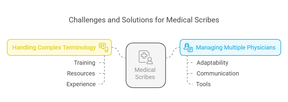 Solution: To handle this challenge, medical scribes undergo rigorous training in medical terminology. This foundation helps them understand common terms and their context, making documentation more efficient. However, when unfamiliar terms arise, scribes have several resources at their disposal, including medical dictionaries, glossaries, and online reference tools. They can also consult directly with the physician to clarify terms if necessary. Over time, scribes become increasingly familiar with specialized medical language through experience, which allows them to adapt to new terms and contexts more effectively. This ongoing learning ensures that scribes can manage even the most complex terminology with greater ease and accuracy.